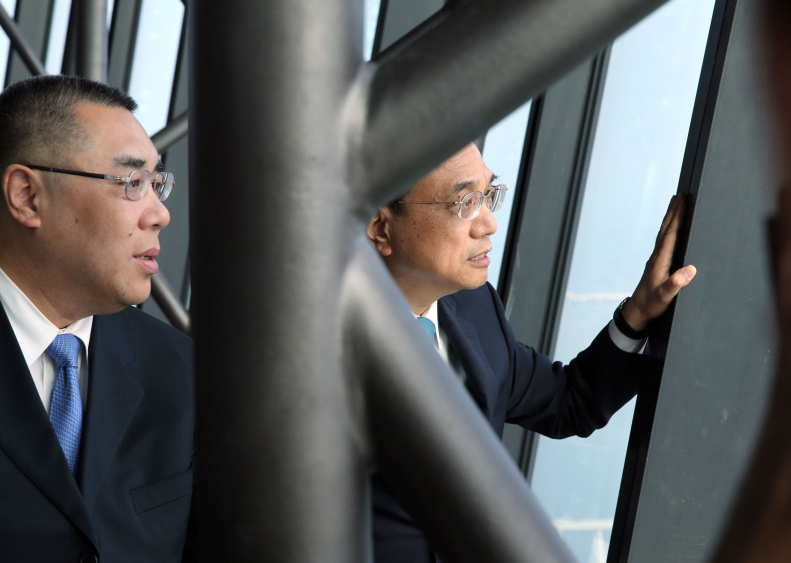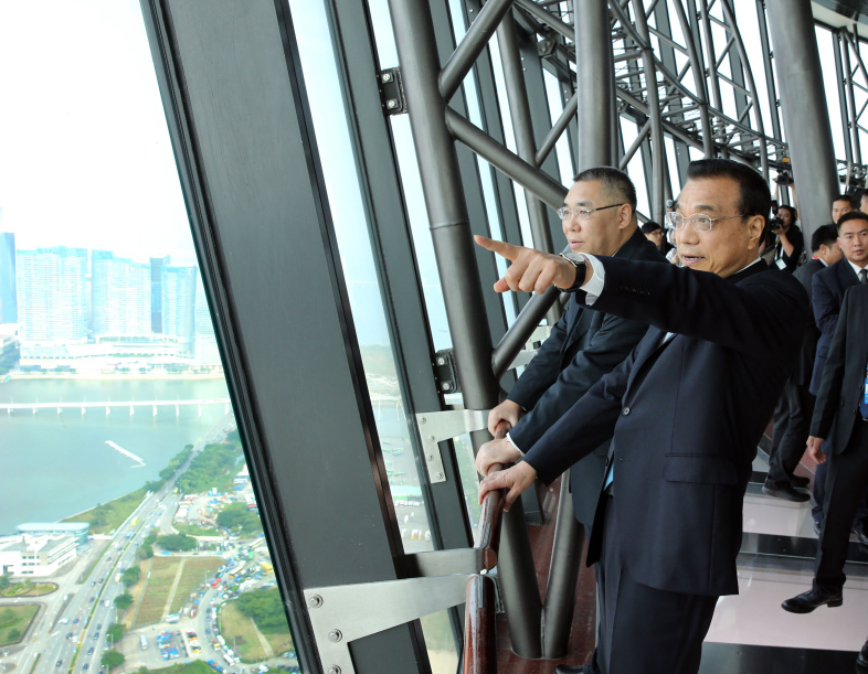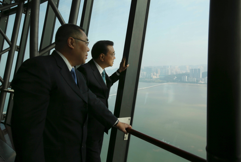 【李克强登上澳门旅游塔俯瞰濠江全貌】正在澳门视察的李克强总理,10日下午在崔世安特首的陪同下登上澳门旅游塔223米高的主观光层,俯瞰濠江全貌,并听取澳门促进经济适度多元可持续发展的产业策略,以及城市发展策略的汇报。