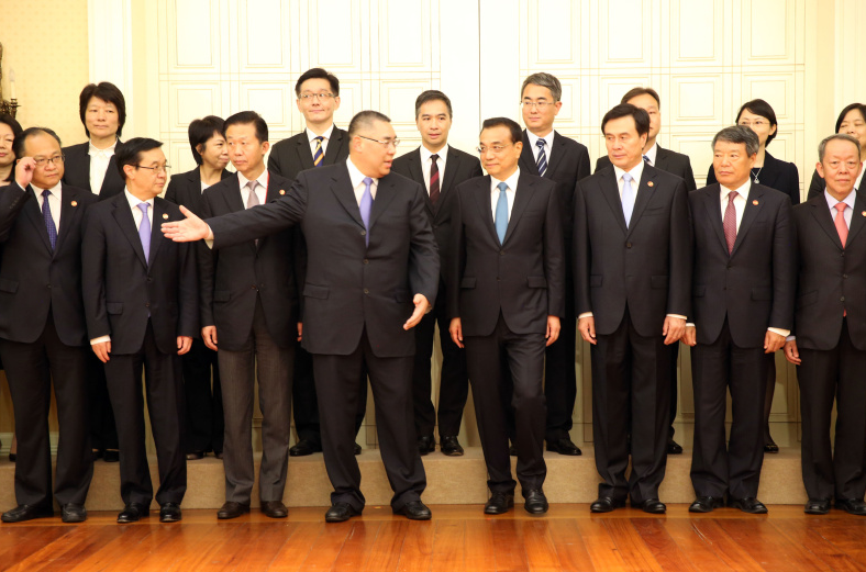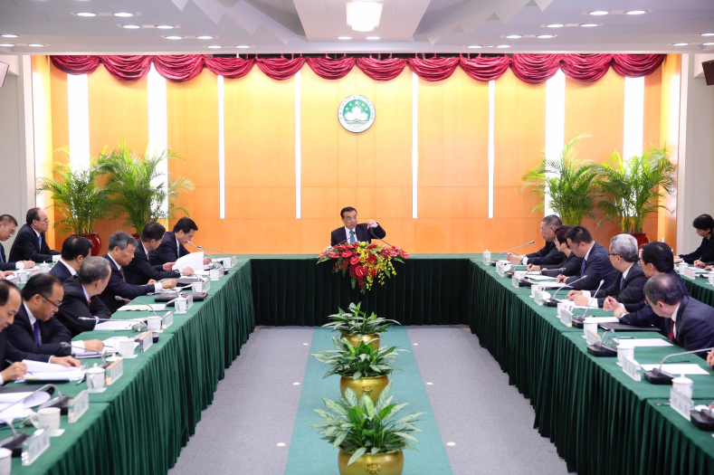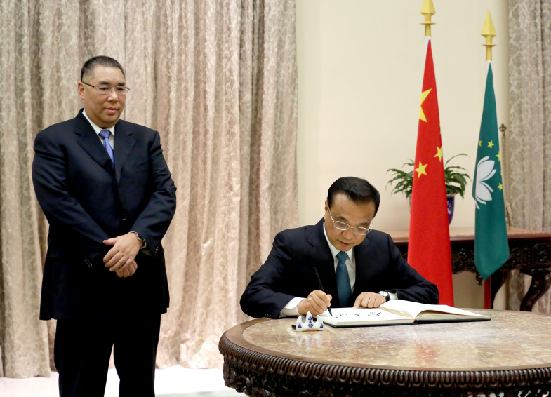 【李克强视察澳门特区政府总部并听取汇报】李克强总理10日下午视察澳门特区政府总部,与特区政府主要官员合影,并在嘉宾签名册上签名。在听取崔世安行政长官及特区政府5位司长的工作汇报后,李克强作了重要讲话。他说,中央政府最近根据新形势下澳门发展的新需求,提出了多项惠澳政策。