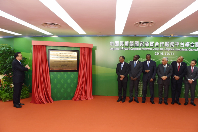 开幕式前,李克强同与会葡语国家领导人共同出席“中国与葡语国家商贸合作服务平台综合体”项目启动仪式,并为“平台综合体”项目揭牌。