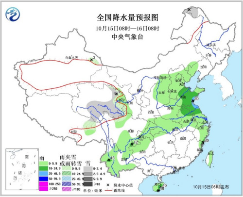 15日08时至16日08时,华北、黄淮、江淮、江汉、江南东北部、西南地区东部和南部、海南岛、台湾大部等地有小到中雨,其中,海南岛东部、山东南部、江苏北部等地的局部地区有大雨;青海中东部、甘肃西南部、西藏中部、川西高原北部等地有小到中雪(雨)或雨夹雪。新疆东部、甘肃中西部、内蒙古中西部等地有4~6级风。南疆盆地南部有扬沙或浮尘。