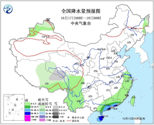 17日08时至18日08时,江南东部、华南、西南地区东部和南部、台湾等地有小到中雨,其中,广东东部沿海、海南岛等地的部分地区有大雨或暴雨,海南岛东北部局地有大暴雨(100~110毫米)。新疆北部、黑龙江东北部、青海南部、西藏中部等地有小雪或雨夹雪。南海北部和中部海域、北部湾将有7~9级大风,其中南海中部部分海域的风力可达10~13级,台风中心经过附近海域将有14~15级大风、阵风16~17级。