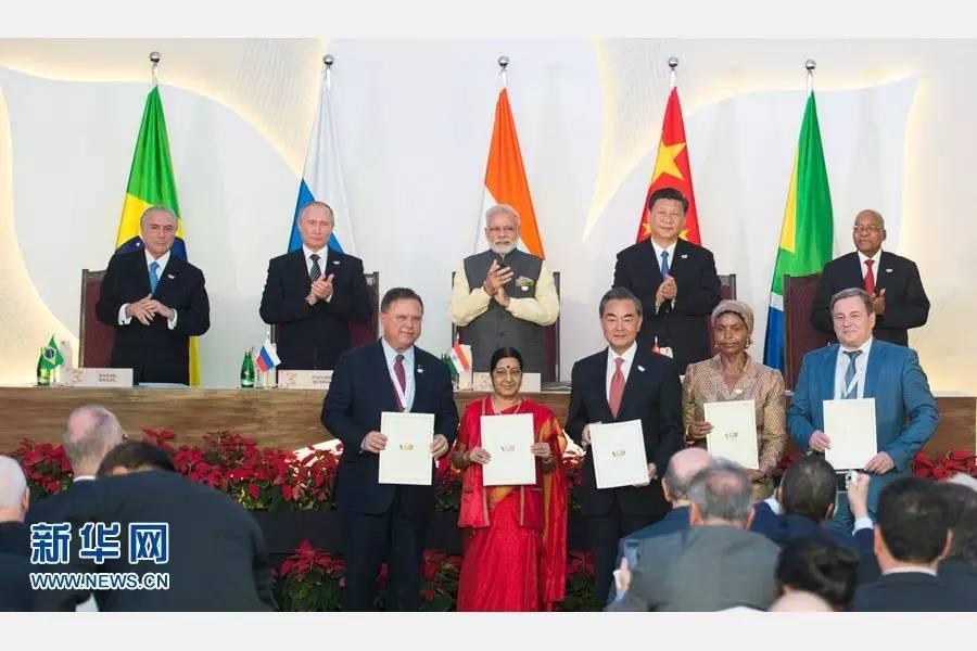 16日,金砖国家领导人第八次会晤在印度果阿举行。中国国家主席习近平、印度总理莫迪、南非总统祖马、巴西总统特梅尔、俄罗斯总统普京出席。5国领导人围绕“打造有效、包容、共同的解决方案”主题,就金砖国家合作及其他共同关心的国际和地区问题深入交换看法,达成广泛共识。