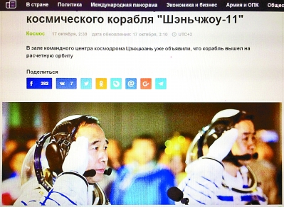 十月十七日,俄罗斯塔斯社网站第一时间发布的题为《中国成功发射神舟十一号载人飞船》的报道。本报驻莫斯科记者汪嘉波摄/光明图片