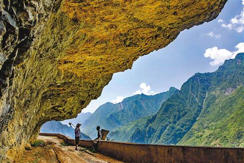 这条机耕道,是在2001年至2003年期间,杨芝汉与其余72个村民,利用钢钎、铁锤等工具在老虎嘴崖壁上凿出的一条路。它的诞生,终于结束了村民进出全靠攀爬崖壁的历史。