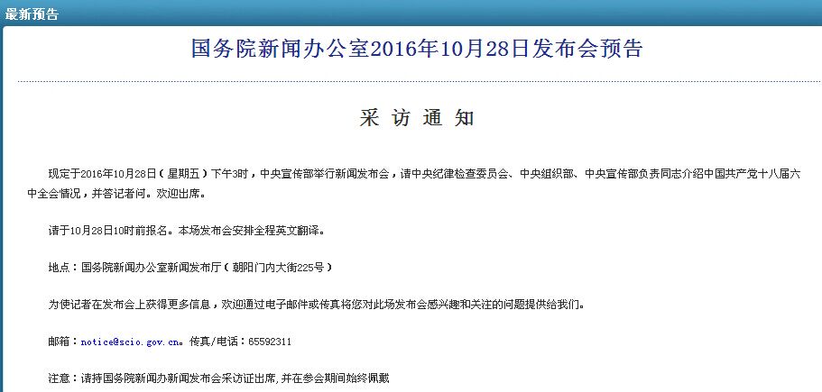 【环球网综合报道】国新办网站10月27日发布预告,定于2016年10月28日(星期五)下午3时,中央宣传部举行新闻发布会,请中央纪律检查委员会、中央组织部、中央宣传部负责同志介绍中国共产党十八届六中全会情况,并答记者问。