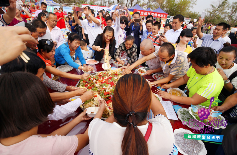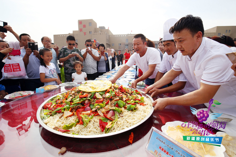 天山网讯(记者孟根傲德报道)“欢迎大家品尝穆沙子清真食堂的超大份拌面!”在第四届新疆(托克逊)拌面文化旅游节上,直径一米的大盘子里50公斤的拌面被食堂的负责人周军端了上来。“大家别客气!”周军卖力地推销着自家的超大份拌面。