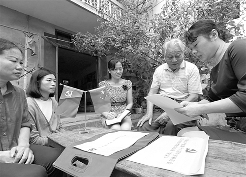 左图 10月28日,江西万安县城东社区干部正在老党员许寅宾家中开展党的十八届六中全会精神宣讲活动。