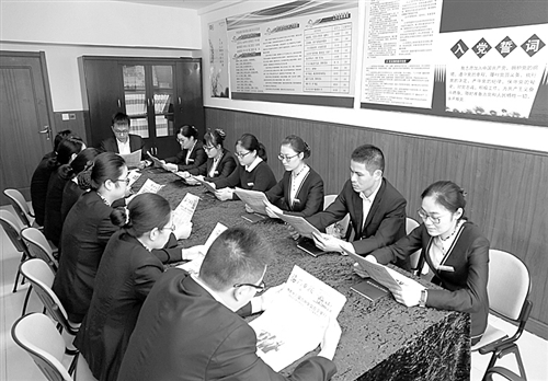 右图 10月28日,江苏海门农行营业部党支部组织全体党员学习党的十八届六中全会公报,党员们纷纷表示,要充分发挥共产党员的先锋模范作用,优化金融服务,为地方经济建设作出新贡献。黄振辉摄