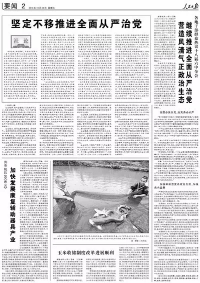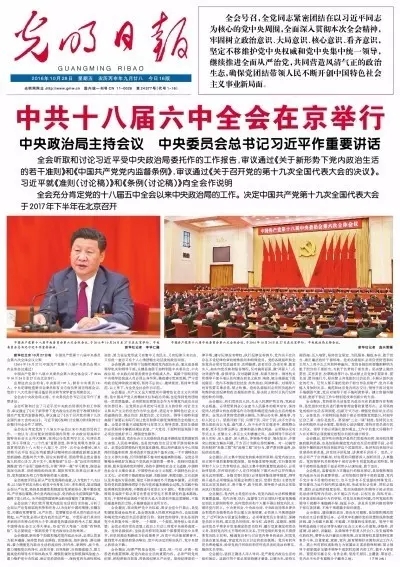 全国各大报纸头版均聚焦十八届六中全会,十八届六中全会公报被放在了报纸版面的最醒目位置,配以通栏标题和庄严的会场照片。人民日报刊发社论《坚定不移推进全面从严治党》、新华社刊发社评《在党中央坚强领导下推进全面从严治党》,高屋建瓴,阐释全会的重要意义,发出坚定不移推进全面从严治党的最强音。