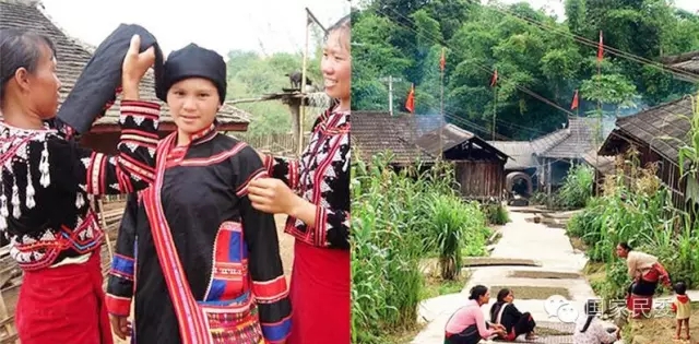 ▲拉祜族姑娘和拉祜族传统民居。