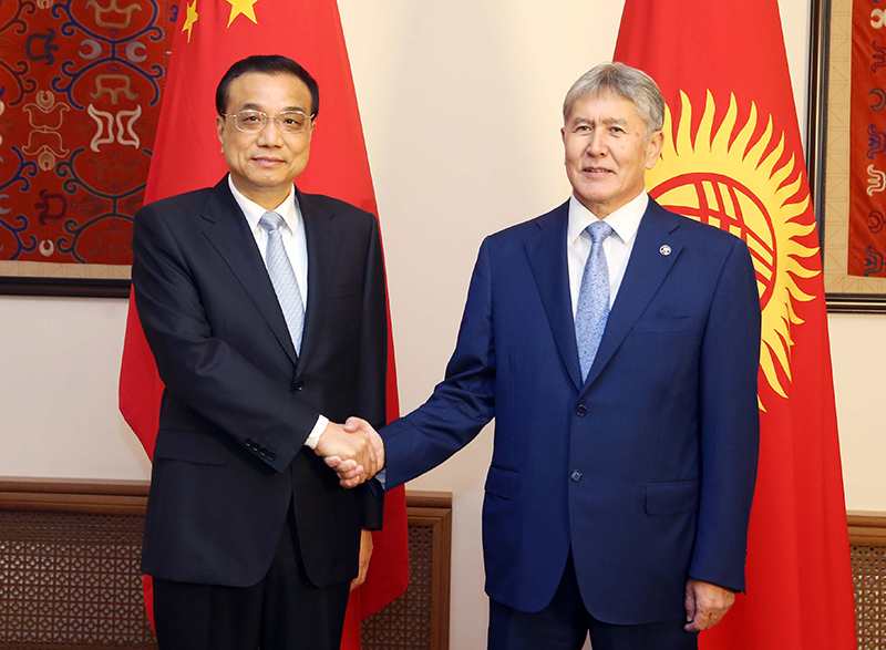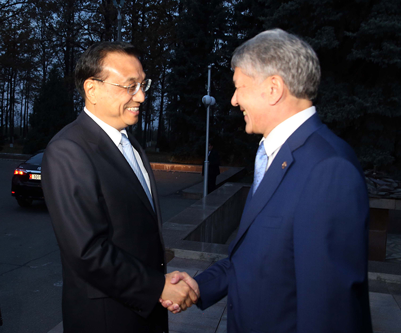 国务院总理李克强当地时间2日晚在比什凯克总统官邸会见吉尔吉斯斯坦总统阿坦巴耶夫。