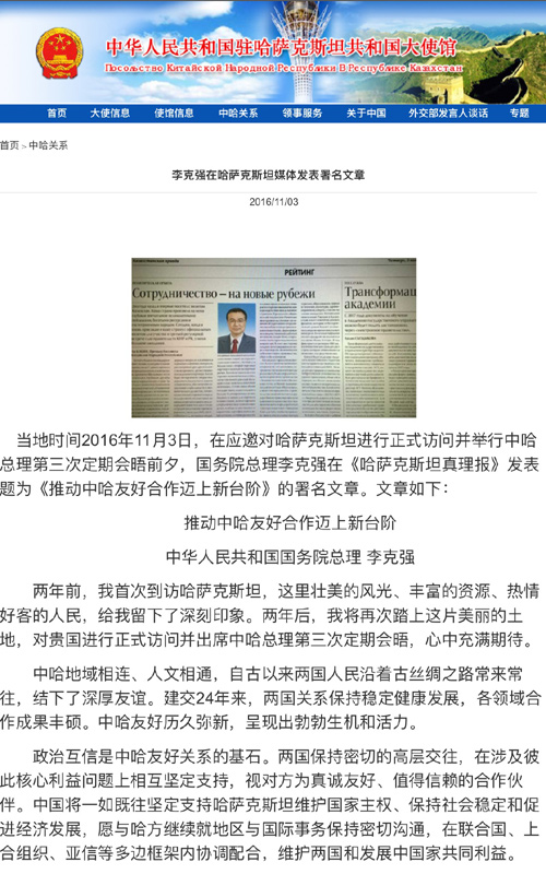【李克强在哈最大报纸发表署名文章】在访问哈萨克斯坦当天,李克强在哈最大报纸《哈萨克斯坦真理报》发表署名文章表示,产能合作是中哈合作中的一大亮点和重要增长点,中方愿与哈方一道,本着开放、协商合作、互利共赢的原则,用实实在在的合作成果惠及两国人民,共同推动中哈友好合作不断迈上新台阶。
