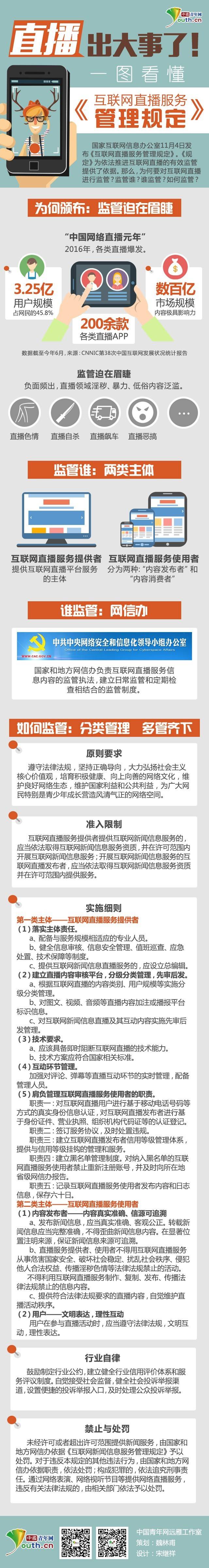 国家网信办今日正式发布《互联网直播服务管理规定》(以下简称《规定》),其中对直播平台和主播的“双资质”规定以及“先审后发”、“即时阻断”的要求都给出了说明。