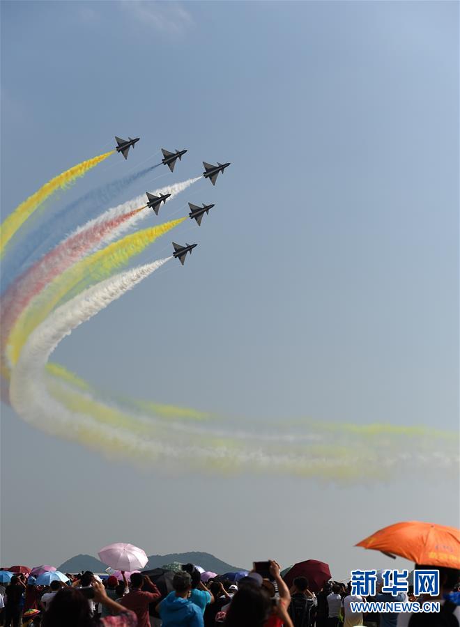 11月6日,观众在航展现场观看飞行表演。当日,在广东珠海举行的第十一届中国国际航空航天博览会落下帷幕。 新华社记者贾宇辰摄