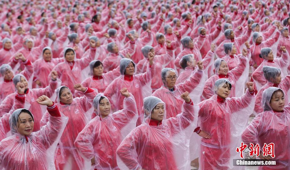 11月7日,在武汉分会场大妈、大叔们在雨中齐跳广场舞。当日,在“西班牙斗牛舞”、“生命之杯”的乐曲中,5万余名中国大妈、大叔们在北京、上海、天津、武汉等14个城市同跳一支广场舞。一起挑战最大规模排舞(多场地)吉尼斯世界纪录。据活动主办方介绍,同一时间、不同场地、同跳一支舞曲,挑战最大规模排舞(多场地)吉尼斯世界纪录,在全国多个重点城市一起举行,是迄今为止全国范围内发起的最大规模广场舞活动。 张畅 摄