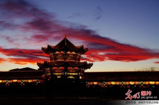 晚霞似火映红天边,恰逢长亭华灯齐放,在火烧云的映衬下壮美奇观惊艳古城,美不胜收。(吴红军摄/光明图片)