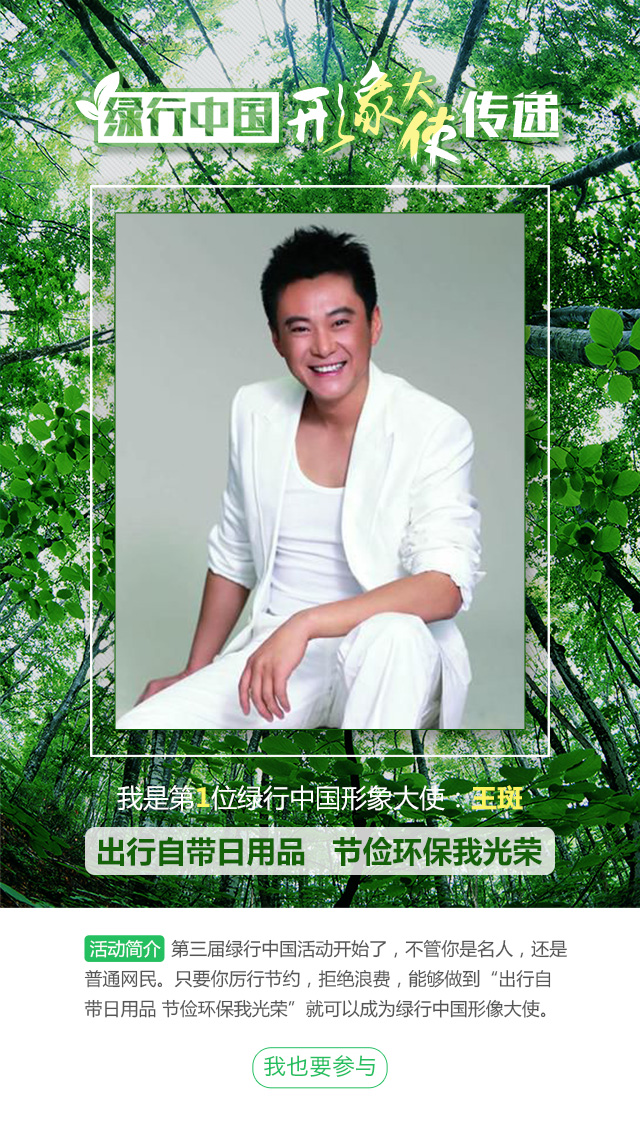 而作为本届活动的最大亮点,绿行中国首次聘请国家一级演员王斑担任形象大使,发挥了名人效应,让绿色环保家喻户晓。王斑与妻子曹颖都通过微博转发了绿行中国的活动报道,并呼吁:让我们从小事做起,从自我做起,“绿行中国”功在当下,利在千秋,出行自带日用品,节俭环保我光荣。烟台最美女孩刁娜也参与其中,在微信中呼吁践行绿色环保。在他们的号召和带动下,近200名网友纷纷参与,争当形象大使,厉行节约,拒绝浪费。