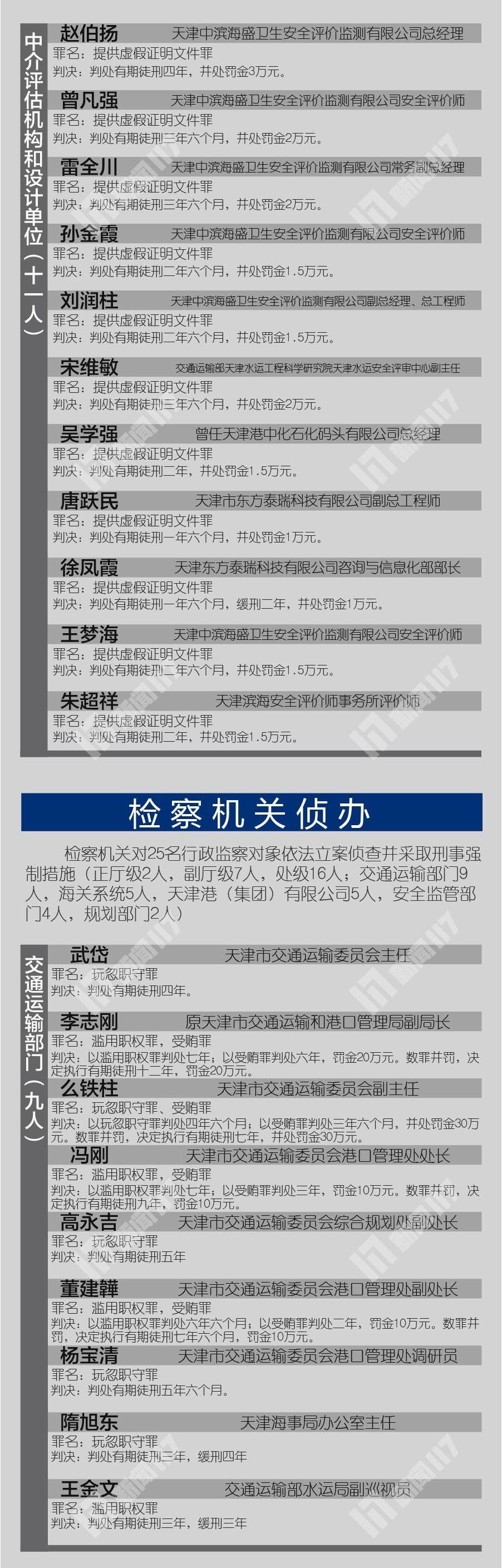 天津交通运输委员会主任武岱等25名国家机关工作人员分别被以玩忽职守罪或滥用职权罪判刑,其中原天津市交通运输和港口管理局副局长李志刚等6人同时犯受贿罪,予以数罪并罚。