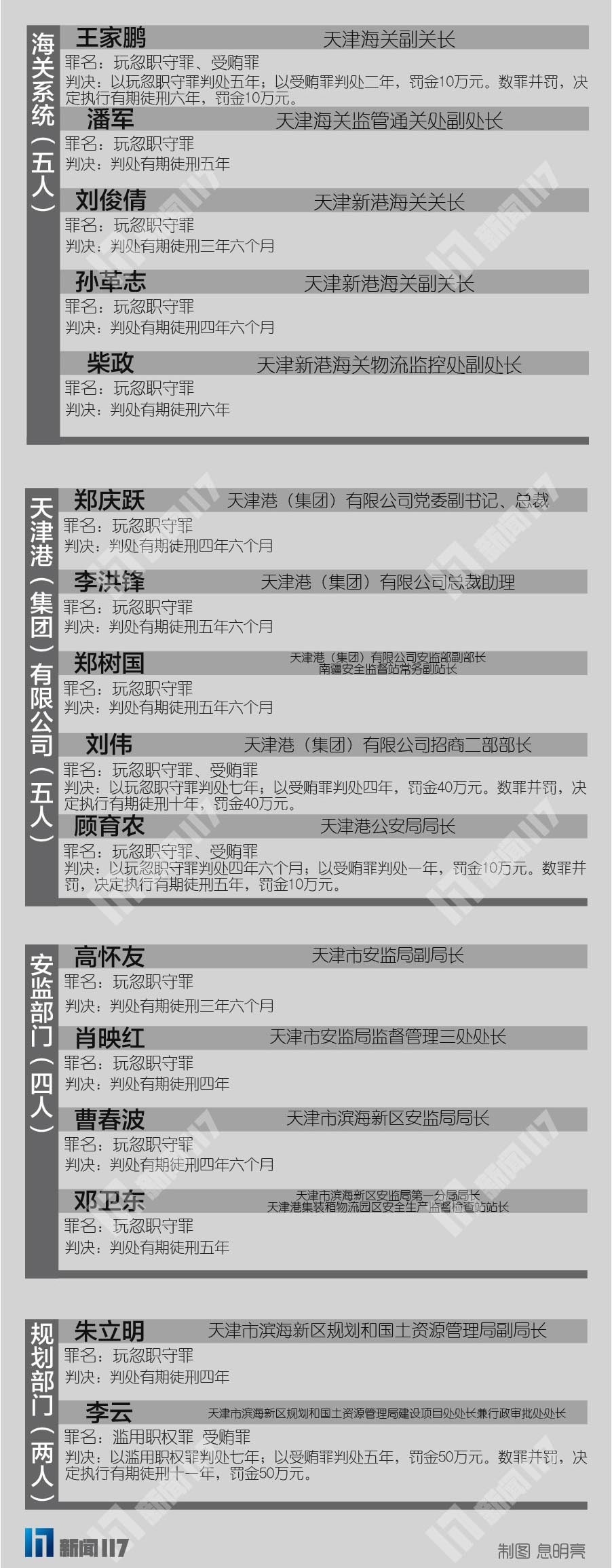 无论滥用职权,还是玩忽职守,都难逃法律的追责。 “8·12”事故系列案件,从涉及政府部门来看,天津市交通运输委员会7人获刑,天津港集团方面5人获刑,天津市两级安监部门是4人,天津海关部门是5人,天津市滨海新区规划和国土局是2人,天津海事局是1人,交通运输部水运局是1人。