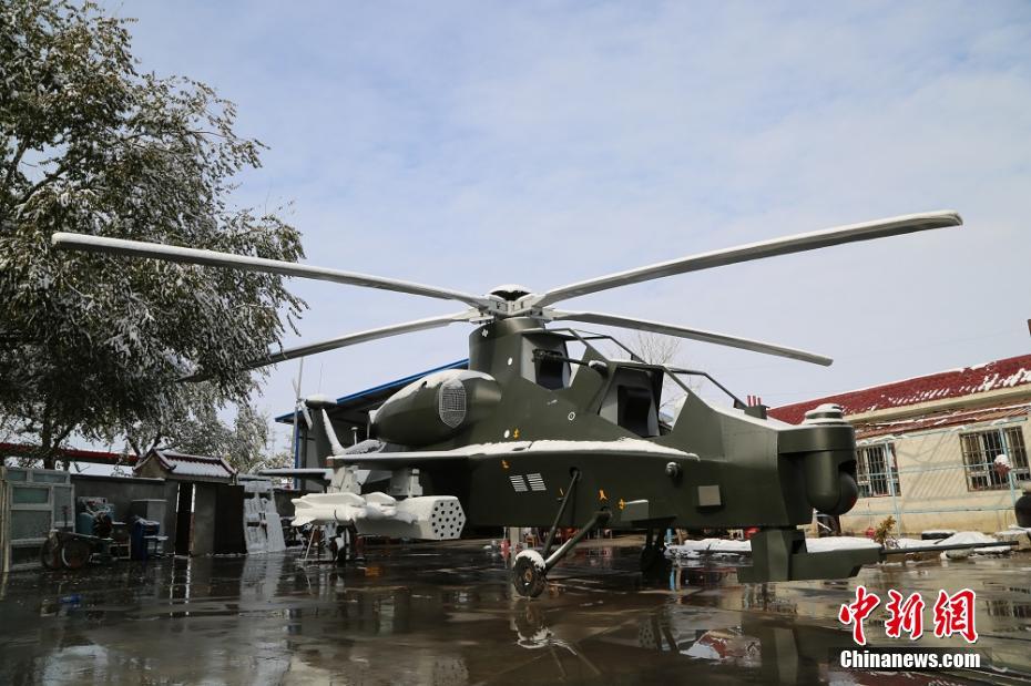 11月9日,在新疆呼图壁县丝路景逸雕塑厂房大院内,一架长达16米的直升机模型高颜值亮相。陶维明 摄