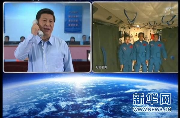 2013年6月24日,中共中央总书记、国家主席、中央军委主席习近平来到北京航天飞行控制中心,同正在天宫一号内执行任务的神舟十号航天员聂海胜、张晓光、王亚平通话。新华社发(截屏照片)