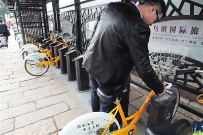 2015年12月8日,浙江乌镇,一位游客正在通过扫描二维码,租赁自行车。新京报记者 李冬 摄