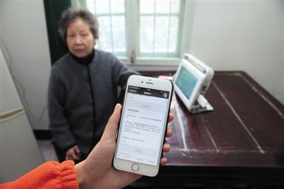 2015年12月8日,乌镇独居老人杨丽娟在家中使用带有网络功能的仪器测量血压。新京报记者 李冬 摄