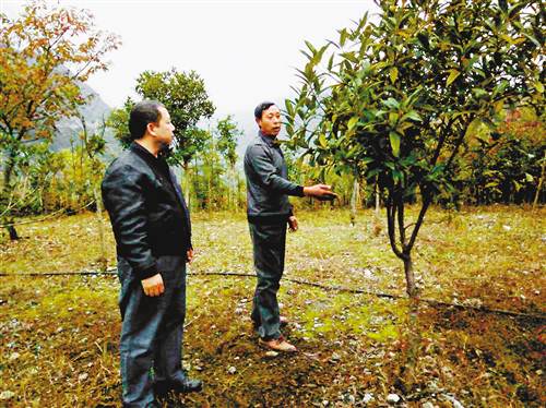 周天松(右)在给村民讲解果树种植技术。通讯员 王豪 摄