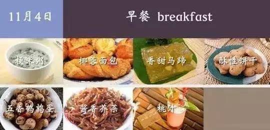 包括粳米粥、椰蓉面包、五香鹌鹑蛋等。