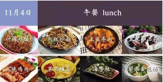 午饭包括什锦炒饭、肉丝炒面、土豆牛肉等;
