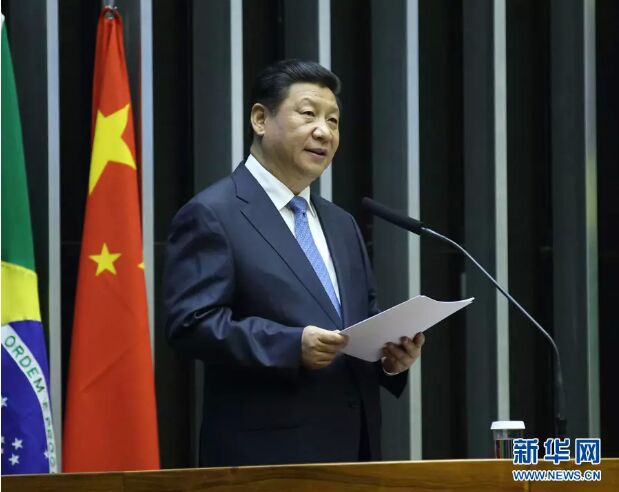 图为:2014年7月16日,国家主席习近平在巴西国会发表《弘扬传统友好 共谱合作新篇》的演讲。