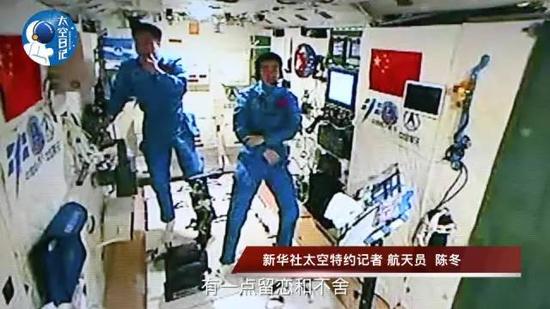 新华社全媒报道平台值班副总监李柯勇:景海鹏指令长、陈冬,你们好!受新华社领导委托,我代表全社同志向你们两位特别的同事致以特别的敬意和感谢!这些天来,你们发回的“新华社特约记者太空日记”的网络阅读量累计已超过1亿人次。这也是历史上航天员首次以新闻记者的身份从太空发回报道。面对全国、全世界的受众,你们想说点什么吗?