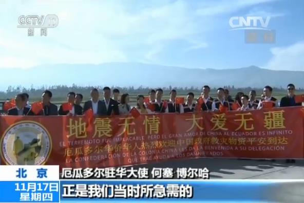 厄瓜多尔驻华大使何塞·博尔哈:中国为厄瓜多尔提供了及时的经济援助,并派出了本国的救援队。他们在抗震救灾中发挥了重要的作用。此外,中国还向厄瓜多尔派出了五架载有人道主义救援物资的飞机。这批物资的内容由中方事先咨询了厄瓜多尔的相关救援机构,因此我们收到的物资正是我们当时所急需的。