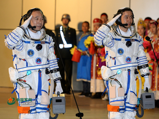 航天员景海鹏(左)、陈冬在出征仪式上敬礼。中国军网记者 岱天荣摄