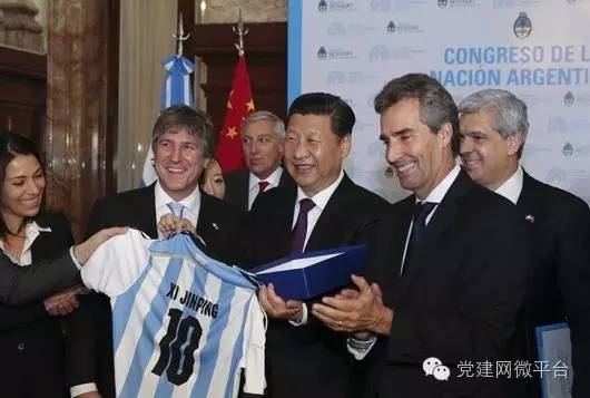习近平说:“刚才众议长先生问我是否喜欢足球,我说我非常喜欢足球。他也祝愿中国能够早日举办一届世界杯,这正是我的愿望。但是我们足球的发展,还希望同阿根廷加强交流合作,靠你们的帮助,提高我们的水平。”