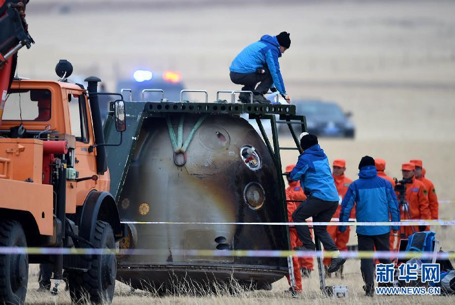 11月18日,工作人员在对返回舱进行处置。记者从空间实验室飞行任务总指挥部了解到,11月18日13时59分,神舟十一号飞船返回舱在内蒙古中部预定区域成功着陆,执行飞行任务的航天员景海鹏、陈冬身体状态良好,天宫二号与神舟十一号载人飞行任务取得圆满成功。新华社记者 任军川 摄