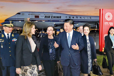 当地时间11月18日,国家主席习近平抵达利马,出席亚太经合组织第二十四次领导人非正式会议并对秘鲁共和国进行国事访问。习近平和夫人彭丽媛受到秘鲁副总统阿劳斯等热情迎接。新华社记者鞠鹏摄