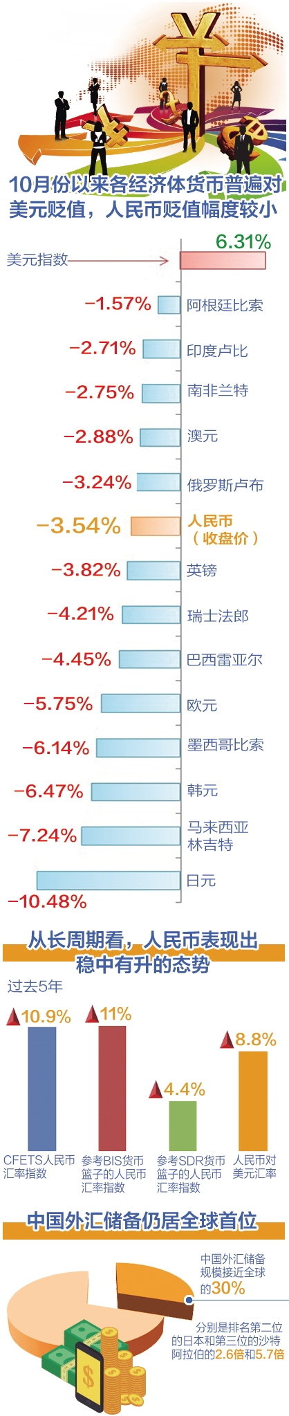 近期人民币对美元有所贬值,但幅度相对大多数非美货币还是比较小的。10月份以来发达经济体货币中,日元、欧元、瑞郎对美元分别贬值10.5%、5.8%和4.2%;新兴市场货币中,马来西亚林吉特、韩元、墨西哥比索对美元分别贬值7.2%、6.5%和6.1%,而人民币对美元只贬值了3.5%,只有美元指数升幅的一半。由于人民币对美元贬值幅度较小,10月份以来人民币相对一些主要货币是显著升值的。例如,在SDR构成货币中,人民币对日元升值7.5%、对欧元升值2.5%、对英镑升值0.5%;在亚洲新兴市场货币中,人民币对马来西亚林吉特、韩元、新加坡元分别升值4.1%、3.3%和1.2%。