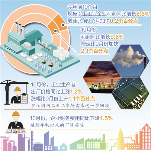 数据显示,今年前10个月,规模以上工业企业利润同比增长8.6%,增速比前9个月加快0.2个百分点。其中,10月份利润同比增长9.8%,增速比9月份加快2.1个百分点。