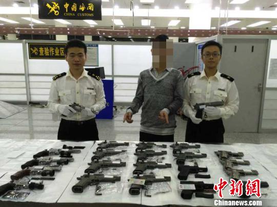 中新网深圳11月28日电(郑小红 蒋昕)深圳皇岗海关28日发布消息称,该关在福田口岸查获一名香港旅客利用背包藏匿枪支弹药入境案件,共查获气动力枪22支、铅制子弹6347发,其他配件若干。据介绍,11月27日晚,深圳福田口岸旅检入境大厅,一位香港男子引起了皇岗海关关员的注意。这名男子背着一个黑色背包入境,步履匆匆穿过海关监管区。图为港男背22把“气动力枪”深圳皇岗口岸入境被海关扣下 蒋昕摄 (来自:中新网)