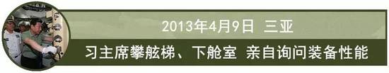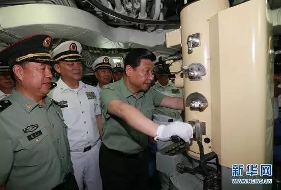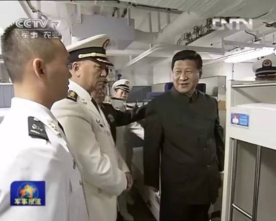 习主席先后视察了井冈山舰和某新型潜艇。检阅结束后,他攀舷梯、下舱室、上甲板、进舰载直升机机舱,了解武器装备性能,询问官兵训练生活情况,接受水兵们赠送的舰帽、舰徽,并在航泊日志上签名。