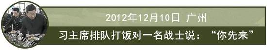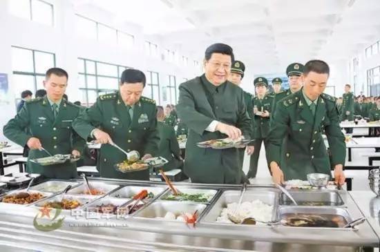 习近平在战士食堂和士兵一起就餐。前面一名战士见习主席过来,连忙礼让,习主席笑着说:“你先来!你先来!”