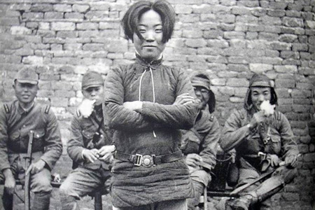 这位站在照片前方,面带微笑、双手交叉的女生叫成本华,安徽和县人,年纪24岁。她身后坐着四个日本兵。