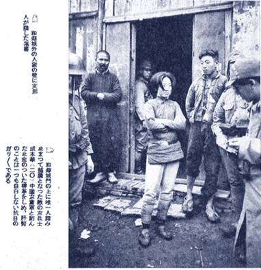 配图的文字介绍寥寥,“和县城门上抓到的唯一敌军士兵、女俘虏成本华,她的腰带上带有‘中国女童子军’字样,这名抗日顽固分子没有吐露丝毫军事机密。”
