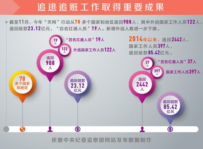“截至11月,今年‘天网’行动共从70多个国家和地区追回908人,其中外逃国家工作人员122人,追回赃款23.12亿元,‘百名红通人员’19人。”12月9日,第13个“国际反腐败日”到来之际,国家预防腐败局副局长、中央纪委国际合作局局长刘建超接受采访时表示,“中国正在以自身追逃追赃的实践引领国际反腐败执法合作。”