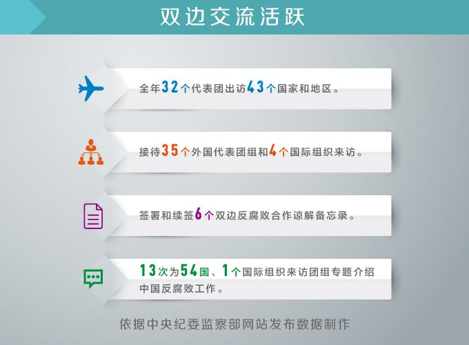 反腐败国际合作的中国声音越来越宏亮、中国故事越来越精彩。从2014年北京APEC峰会通过《北京反腐败宣言》,到2016年G20杭州峰会通过《二十国集团反腐败追逃追赃高级原则》《二十国集团2017-2018年反腐败行动计划》,在华设立G20反腐败追逃追赃研究中心;从2016年组织32个代表团出访43个国家和地区、接待35个外国代表团组和4个国际组织来访,到签署和续签6个双边反腐败合作谅解备忘录、13次为54国1个国际组织来访团组专题介绍中国反腐败工作,中国的主张越来越被国际社会倾听,拒绝腐败分子入境、追缴和归还腐败资产越来越成为国际反腐败合作的重要议题。