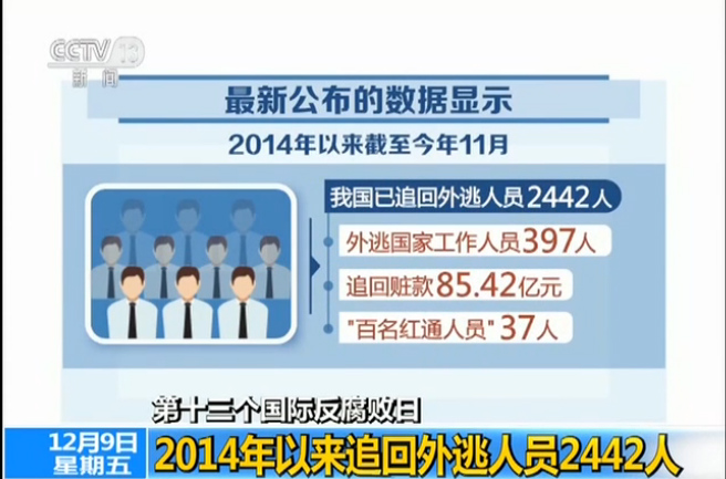 中央反腐败协调小组国际追逃追赃工作办公室最新公布的数据显示,2014年以来,截至今年11月,我国已追回外逃人员2442人,其中外逃国家工作人员397人,追回赃款85.42亿元,“百名红通人员“37人。