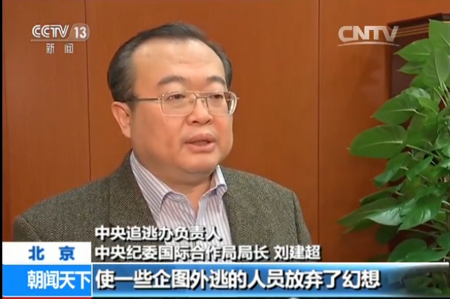 中央追逃办负责人、中央纪委国际合作局局长 刘建超:我们形成了全球追逃追赃的态势之后,这些人举得自己的压力大了,不管坐的什么车,不管住在什么房子里,他们是惶惶不可终日,觉得我有一天会被追回去,我是被追逃者,所以我想再次告诫他们,追逃者的脚步确实离他们越来越近。