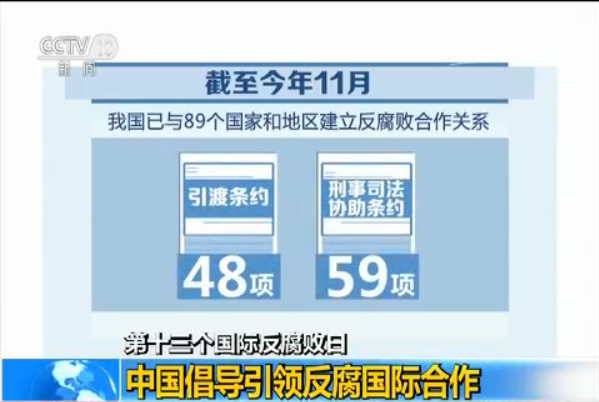 在双边合作方面,截至今年11月,我国已与89个国家和地区建立反腐败合作关系,对外缔结48项引渡条约和59项刑事司法协助条约。其中,今年新签署刑事司法协助条约和引渡条约12项,签署和续签6个双边反腐败合作谅解备忘录。