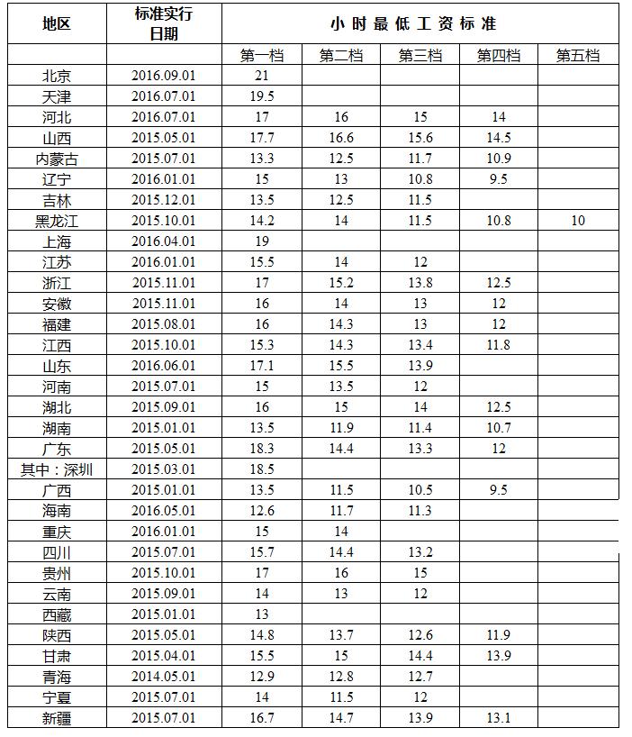 第一档小时最低工资标准,北京最高,为21元。天津(19.5元)与上海(19元)分列第二、三位。